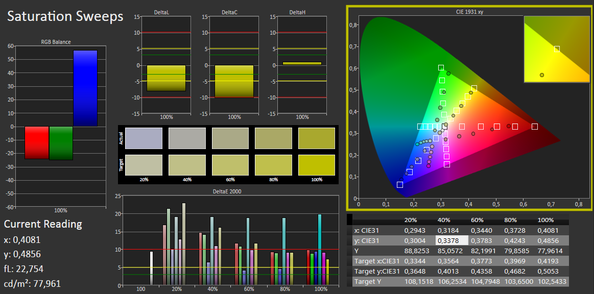 Die Farbdarstellung des Bildschirms entspricht ebenfalls dem Preisniveau des Notebooks. Im Auslieferungszustand liegt die durchschnittliche DeltaE-2000-Abweichung des Bildschirms bei einem Wert von 11,56. Zielbereich wäre ein DeltaE-2000-Wert kleiner als 3. Darüber hinaus weist der Bildschirm einen deutlichen Blaustich auf.