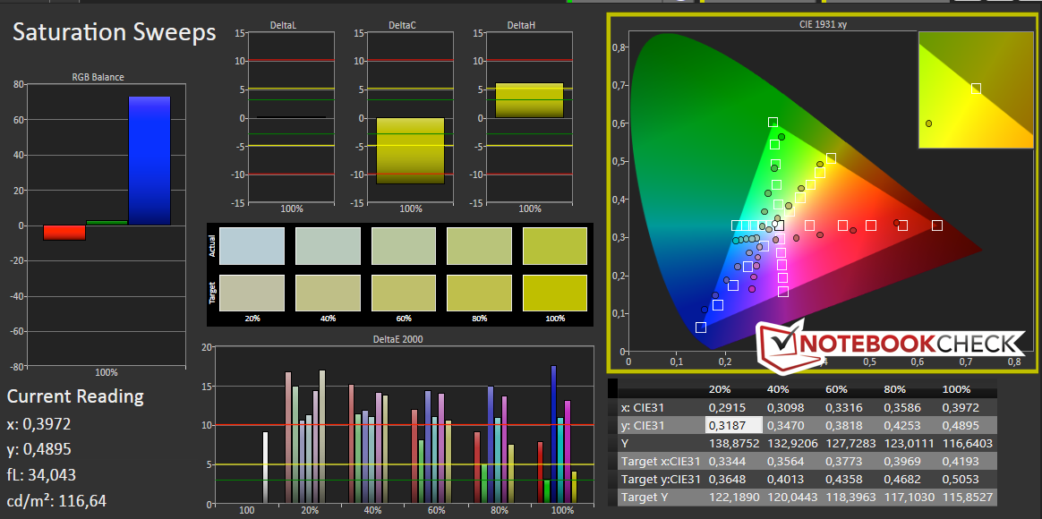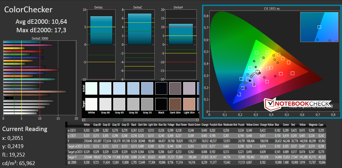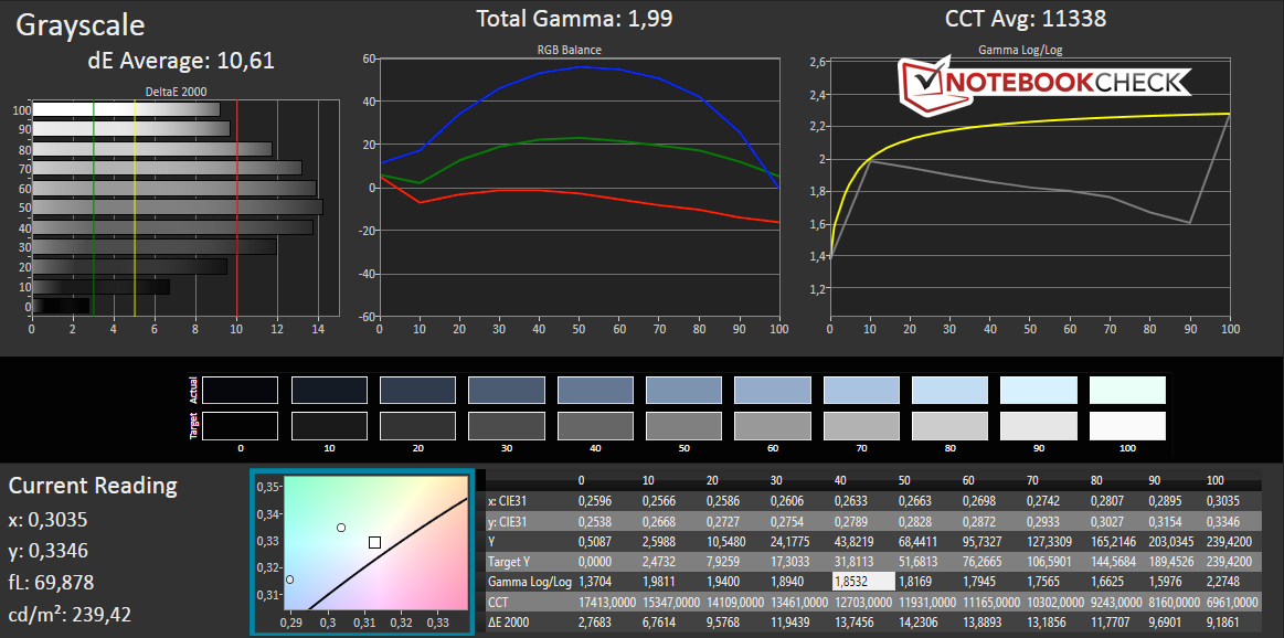 Die Analyse der Farben und Graustufen zeigt mit Werten über zehn weitere Schwächen des Displays. Durch den hohen DeltaE-Wert der Graustufen ist ein Blaustich wahrnehmbar. Auch die Blickwinkelstabilität des TN-Panels fällt äußerst mager aus. Im Außeneinsatz kann das Gerät durch ein mattes Display punkten, sollte aber nur bei bewölkten Umgebungen genutzt werden, da die Helligkeitswerte zu gering sind.