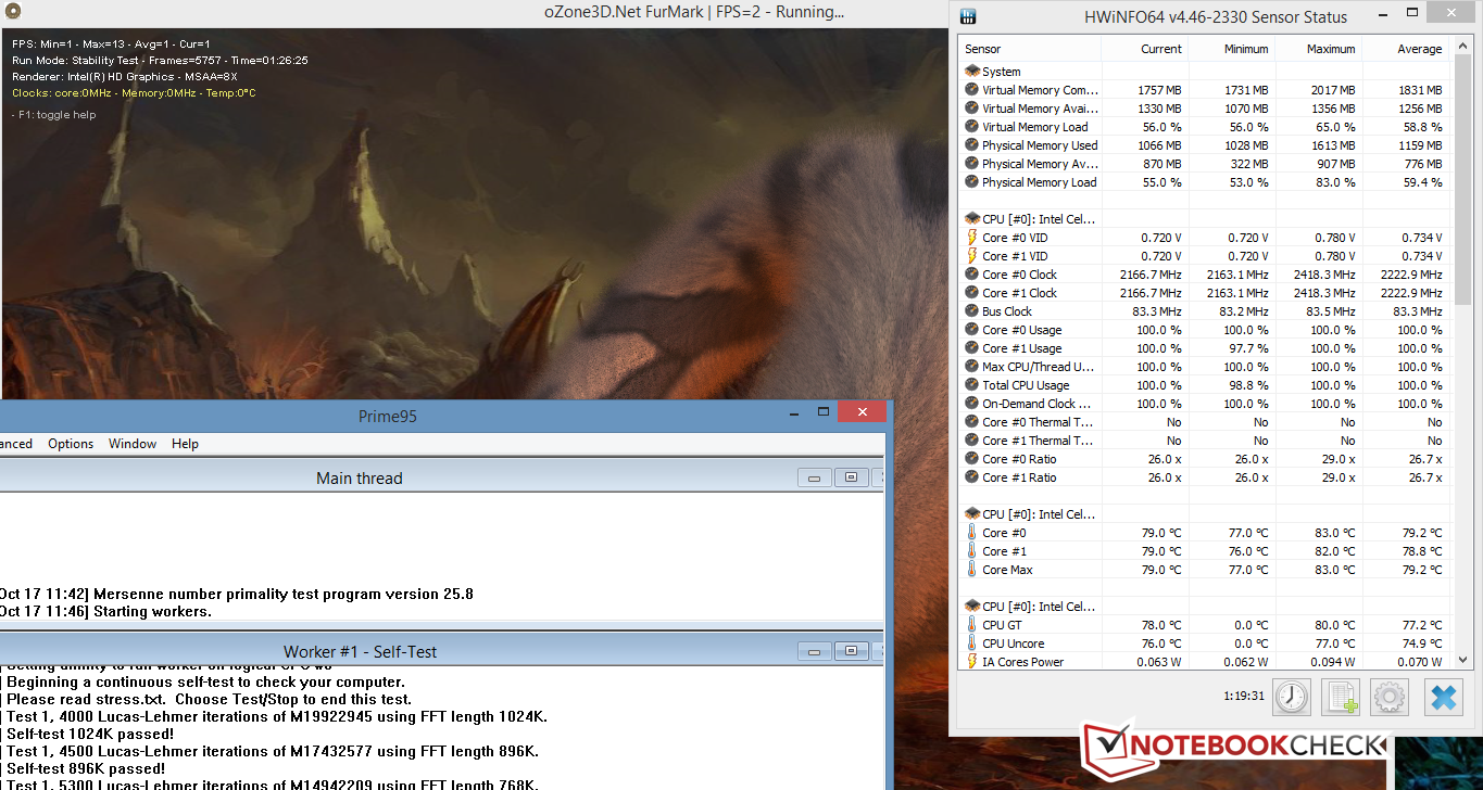 Trotz fehlender Lüfter bleibt das HP im Idle-Modus konstant kühl. Der Hotspot von 31,5 °C liegt etwa 2 °C über den Geräten der Konkurrenz, welche allerdings mit Lüftern versehen sind. Interessant wird der Last-Betrieb, welcher mit maximal 45,7 °C deutlich wärmer als die Wärmespitzen der Vergleichsmodelle ist. Das ebenfalls lüfterlose Lenovo B50-30 erzielt wohl meist ähnliche Hitzeentwicklungen, bleibt jedoch unter Last partiell kühler. Über die Dauer des Stresstestes hinweg konnte das Testgerät eine durchschnittliche Taktung von 2.223 MHz erreichen. Der Basistakt wurde selbst nach einer Stunde nie unterschritten.
