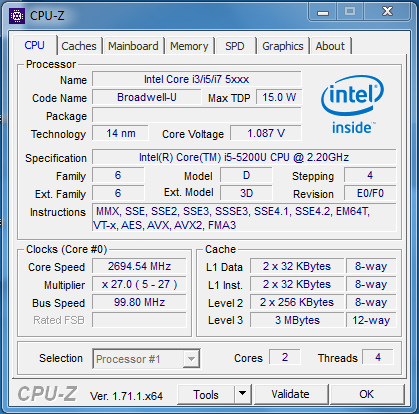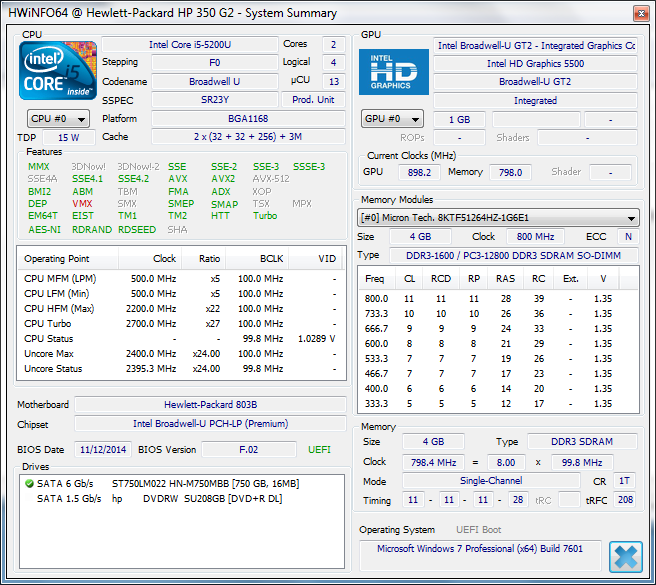 Der Core i5-5200U Prozessor arbeitet mit einer Basisgeschwindigkeit von 2,2 GHz. Mittels Turbo kann die Geschwindigkeit auf 2,5 GHz (beide Kerne) bzw. 2,7 GHz (nur ein Kern) erhöht werden. Die volle Leistung der CPU steht sowohl im Netz- als auch im Akkubetrieb zur Verfügung. Der Broadwell Prozessor liefert bis zu 10 Prozent Mehrleistung als ein Haswell Vorgänger wie der Core i5-4210U Prozessor. Letzterer steckt in dem bereits von uns getesteten Vorgänger des HP 350 G2, dem HP 350 G1.