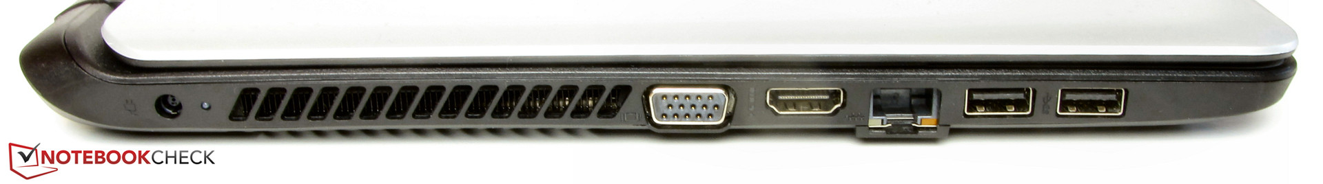 Das HP 350 G2 ist mit einer gängigen Schnittstellenauswahl bestückt. Drei USB-Steckplätze finden sich an Bord, von denen zwei nach dem USB-3.0-Standard arbeiten. Zudem sind zwei Videoausgänge (VGA, HDMI) vorhanden. Die Anordnung der Schnittstellen fällt suboptimal aus. Diese befinden sich auf Höhe der Handballenablage.