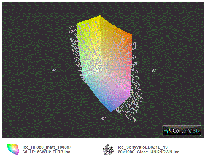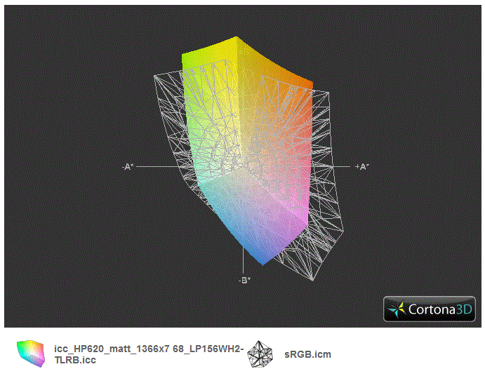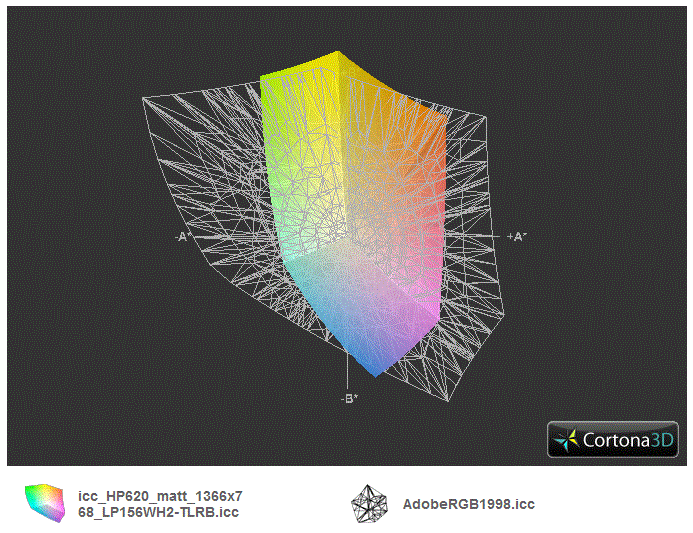 Von Seiten des Farbraumes hat das LG-Panel ebenso keine Vorteile zu bieten. Vom Adobe RGB (t) deckt das Panel nur gut die Hälfte ab. Besser sieht es bei sRGB (t) aus, jedoch fehlen auch hier noch etliche Farbnuancen. Im Vergleich zu einem guten Consumer-Display, wie im Sony Vaio VPC-EB3Z1E (t), muss sich das HP 620 geschlagen geben.