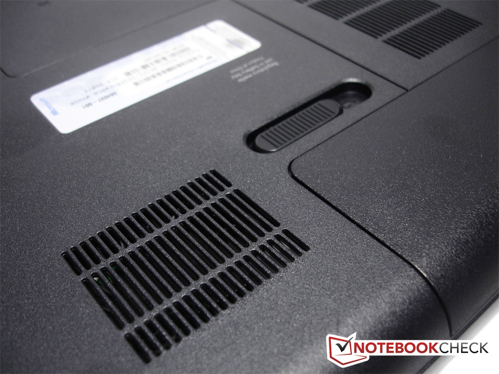 Auf der Unterseite zeigt sich ein ähnliches Bild, wie schon in den Zeilen weiter zuvor beschrieben. Schlichtes Design gepaart mit dem Notwendigsten ziert hier das Bild. Zwei Deckel verbergen die elementarsten Komponenten, können aber binnen Sekunden demontiert werden. Die Unterseite zeichnet sich durch Robustheit und Stabilität aus. Die Abdeckungen lassen sich nicht eindrücken und bieten genügend Schutz für die darunter liegenden Bauteile wie den RAM-Modulen, Festplatte und dem W-LAN-Modul. Für die Kühlung des Notebooks sorgt ein kleiner 30mm Lüfter, welcher über einen kleinen Luftschlitz auf der Unterseite sowie zur Seite selbst Luft abführt. Für sicheren Halt auf einem Tisch sorgen vier, an den Ecken verteilte, Gummifüße.