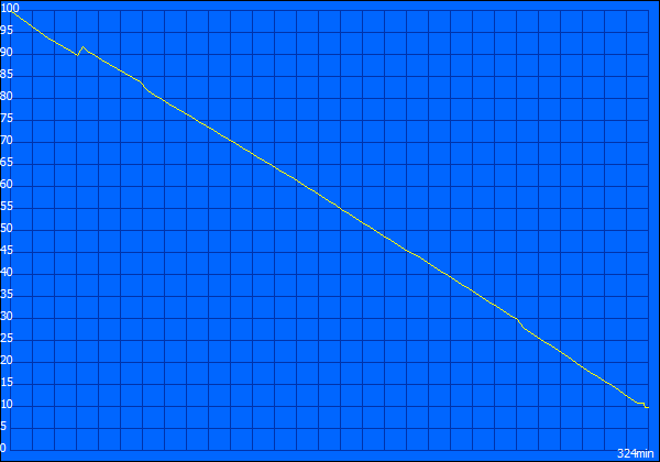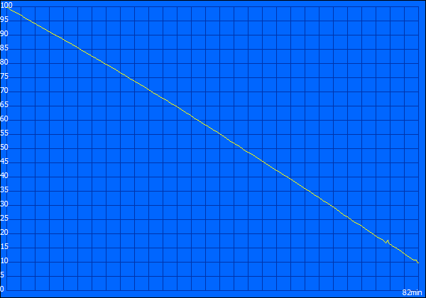 Angeschlossen am Netzteil bzw. an der Steckdose, konnte dem System eine Leistungsaufnahme im Bereich von 9,3W bis zu 40,9W nachgewiesen werden. Im Extremfall ist der Akku damit nach nur 1 Stunde und 36 Minuten leer. Diese Werte wurden mit dem genormten Benchmark Programm Batterie Eater Classic ermittelt. Dabei wird eine gerenderte Grafik erstellt, die das Notebook bzw. den Akku maximal belastet.