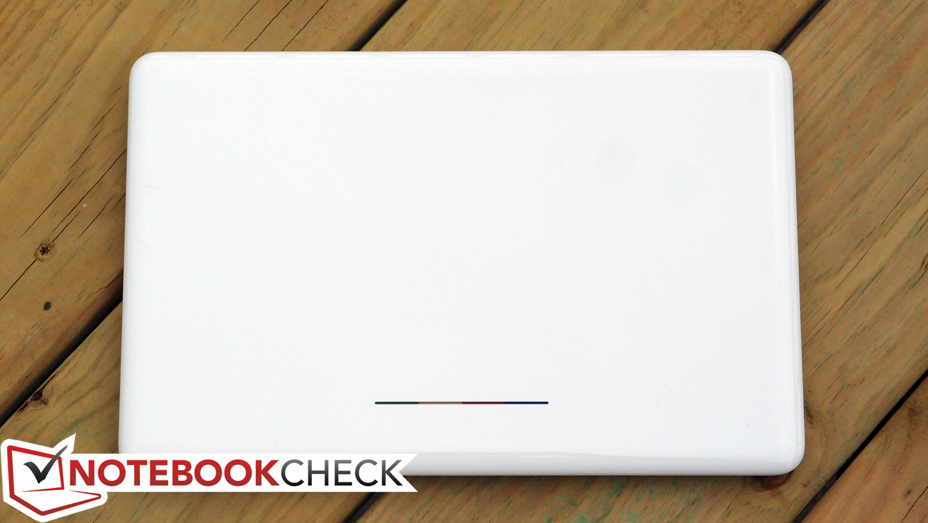 Mit seinem schlanken und klaren Design könnte das Chromebook 11 auch aus Apples Produktkatalog stammen. Hochglänzende, weiße Oberflächen dominieren das Erscheinungsbild und werden lediglich von einzelnen Farbstreifen an der Tastatur oder auf dem Display-Deckel (beleuchtet) ergänzt. Der ziemlich breite Display-Rand des 11 Zoll großen Bildschirms hat eine matte Oberfläche, was in unseren Augen eine sehr gute Entscheidung ist. Das gesamte Aussehen passt nicht wirklich zu einem billigen Computer, tatsächlich ist uns noch kein besser aussehender Plastikzwerg untergekommen. Falls das bisher noch nicht klar geworden ist: Wir haben es mit einem äußerst mobilen Gerät zu tun. Neben einer Höhe von lediglich 16 mm stoppt die Waage bei nur 1,044 kg.