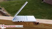 Im Außeneinsatz ist die glänzende Bildschirmoberfläche leider nicht sehr hilfreich. Im Schatten ist noch alles in Ordnung, bei hellen Lichtquellen nehmen die störenden Reflexionen aber schnell Überhand. Die gute Helligkeit und der gute Kontrast können dieses Problem zumindest teilweise ausgleichen und ermöglichen auch einen begrenzten Einsatz in helleren Umgebungen. Zu guter Letzt überprüfen wir die Blickwinkelstabilität: Wie wir es von einem IPS-Display erwarten, sind die Blickwinkel sehr groß. Es spielt keine Rolle, von welcher Seite wir auf das Notebook schauen: Der Inhalt ist selbst unter extremen Winkeln stets sichtbar.