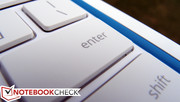 Der Vergleich mit einer normalen Tastatur zeigt einige kleine Anpassungen. Strg und Alt auf der linken Seite sind sehr groß, um die Lücke zur Leertaste auszufüllen (normalerweise durch Fn- und Windows-Taste belegt). In der obersten Reihe wurden die normalen Sondertasten durch spezielle Tasten ersetzt, die optimal an das Betriebssystem angepasst wurden. Es gibt Tasten für die Browser-Navigation (Vor, Zurück, Aktualisieren), Helligkeits- und Lautstärkeeinstellung, sowie den Power Button oben rechts. Diese Tasten sind lediglich halb so hoch wie die restlichen Tasten und ermöglichen damit eine komfortablere Tastatur-/Touchpad-Kombination. Die Anordnung hinterlässt einen sehr aufgeräumten Eindruck und nutzt den vorhandenen Platz optimal aus.