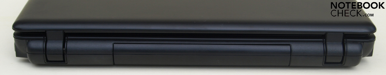 Aufgrund der Gestaltung des Aufklappmechanismusses wäre es auch gar nicht möglich einen nach hinten überstehenden AKKU sinnvoll einzusetzen, da man damit den Bildschirm nicht mehr ausreichend aufklappen könnte. Der Öffnungswinkel ist, wegen der am Bildschirm angebrachten, gewinkelten Schaniere ohnehin schon auf etwa 135 Grad beschränkt.