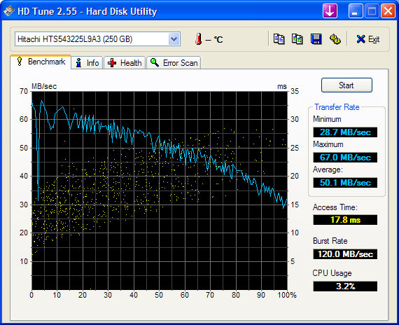 Verfügbar sind die HP 6735s massenspeichertechnisch mit 160 GB, 250 GB oder 320 GB Festplatten die alle mit 5400 U/min arbeiten. Die bei unserem Testmodell verbaute Hitachi Festplatte hat mit 250 GB Kapazität ausreichend Platz und liegt auch hinsichtlich der Transferraten von 50,1 MB/s (Durchschnitt) im guten Mittelfeld. Zudem ist diese geräuschmäßig kaum wahrnehmbar und bietet so ein hohes Maß an Komfort. Mit HP Drive Guard liefert der Hersteller auch ein Feature, das bei einem möglichen Sturz für ein rechtzeitiges Parken der Schreib-/Leseköpfe sorgt und somit einem möglichen Defekt und Datenverlust vorbeugt.