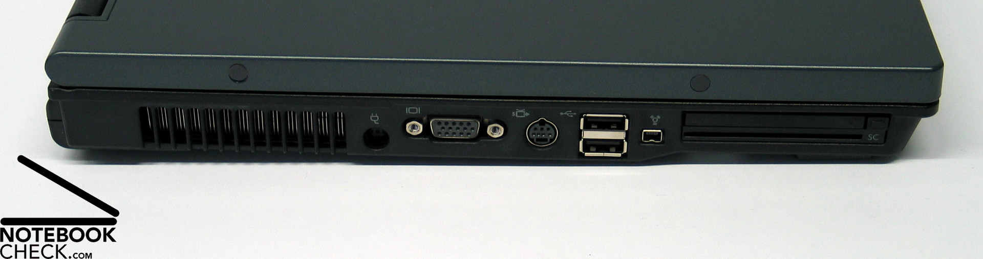 Die Anschlüsse des nx9420 müssen aufgrund des an der Rückseite platzierten Akkus zum Großteil auf die Seiten ausweichen. Besonders an der linken Gehäuseseite, aber ebenso an der rechten Seitenkante rücken die Ports relativ weit nach vorne. Sollte man das Gerät also ohne Docking Station betreiben, und eine Vielzahl der Anschlussoptionen auch ausnützen, kann es schon zu einer erheblichen Einschränkung des Arbeitsbereiches, links und rechts des Gerätes, durch diverse Kabel und Stecker kommen.