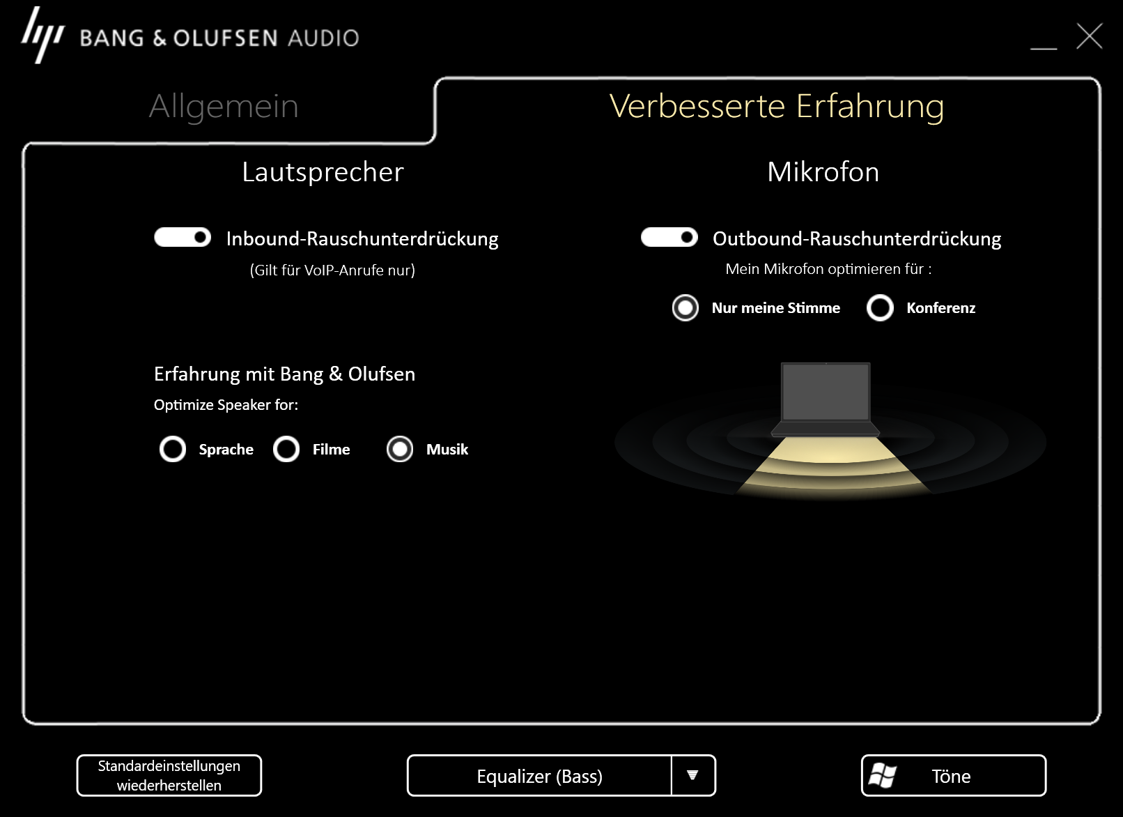 Die beiden Lautsprecher stammen von Bang & Olufsen, befinden sich links und rechts am Rand und sind dem Anwender zugeneigt. Somit kann der Sound ungehindert aus dem Gehäuse an den Nutzer geleitet werden. Außerdem ist die Gefahr sehr gering, die Lautsprecheröffnungen im Tablet-Modus zu verdecken.