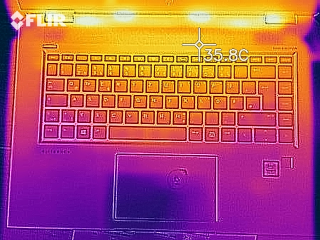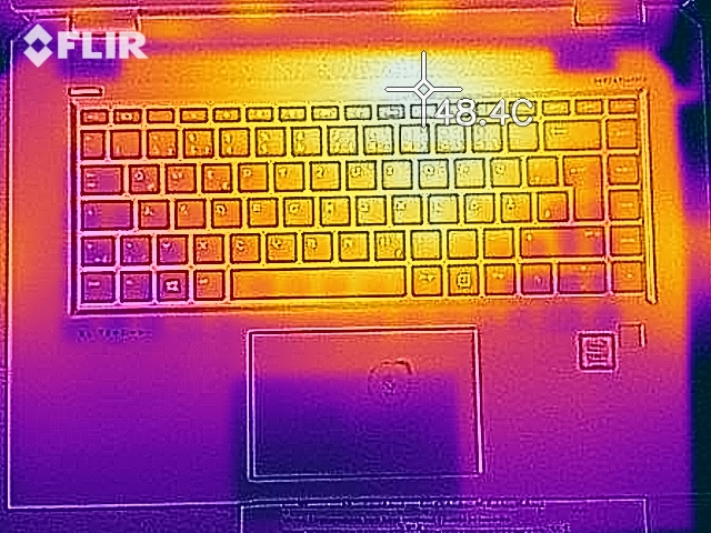 Die Temperaturen im Außenbereich bleiben beim HP EliteBook 1050 G1 selbst unter Last in einem unkritischen Bereich, maximal wird an der Unterseite eine Temperatur von 46 °C erreicht. Zum Vergleich: Das Dell XPS 15 9570 wird mit dem i5-8300H schon deutlich wärmer, es erreicht maximal 55 °C.