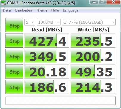 Mitnichten: Beim Lesen kleiner, verstreuter Dateien (4K-Tests) liegt das X1 Carbon (SanDisk SD5SG2256G1052E) deutlich vorne (+39 %). Danach folgen aber auch schon unser Testgerät und seine Schwester 2570p (beide Micron RealSSD C400).