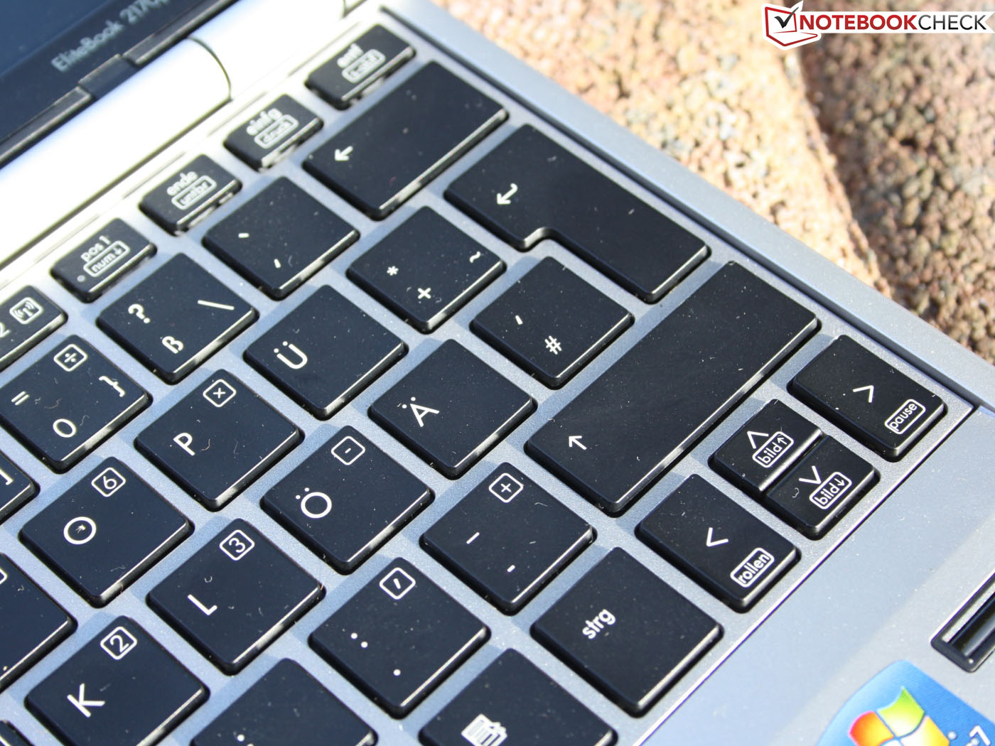 HP hat sein 2170p mit freistehenden Tasten ausgerüstet, welche in einer Vertiefung von zwei Millimetern ruhen. Auf diese Weise enden die Tasten mit der Handauflage auf gleicher Höhe. Das Tastenbett liegt extrem fest auf, was für einen festen, beinahe harten Anschlag sorgt. Es tippt sich dennoch fast geräuschlos. HP hat auch an die Zielsicherheit gedacht und den Buchstaben eine schwache konische Wölbung verpasst. Sie ist optisch gerade noch sichtbar, genügt aber, um den Fingern beim Tippen Orientierung zu bieten.