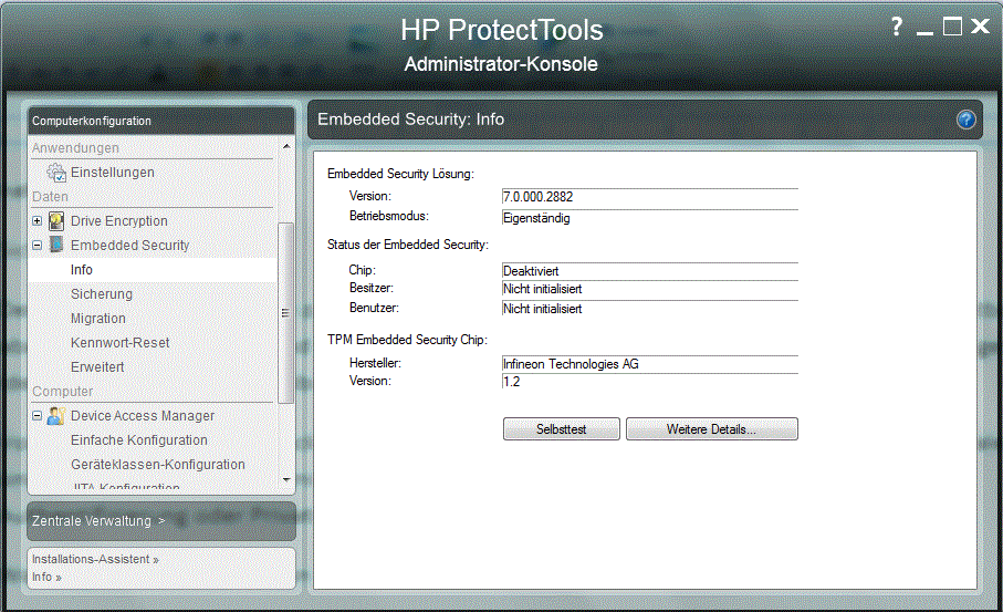 Der Smartcard-Reader kann zum authentifizierten Login benutzt werden. Unsichtbar, aber vorhanden sind das Trusted Plattform Modul (TPM) als auch Intels AMT für die Fernwartung und die eindeutige Identifizierung des Subnotebooks in Netzwerken. Von Seiten der Software spielt HP das volle Programm der Business-Klasse auf: Die Zentrale sind die Protect Tools Administrator Konsole bzw. Security Manager. Verschlüsselung, Authentifizierung oder Privatsphäre, hier können sehr detaillierte Settings gesetzt werden.