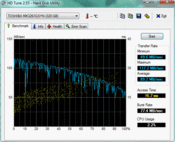 Vom Festspeicher sind auf Grund seiner rotierenden Eigenschaften keine Performance-Sprünge zu erwarten. Der HDD Sub-Score des PCMark Vantage liegt aber immerhin bei 4.190 Punkten. Grund sind die 7.200 U/min. SSDs, die sich langsam bei den Laptops etablieren, sind deutlich schneller (20 bis 25 Tsd. Punkte). Die Festplatte (320 GB) aus dem Hause Toshiba liest mit 89 MByte/s im Sequential Read (HD-Tune), ein deutliches Indiz für die höhere Rotationsgeschwindigkeit.