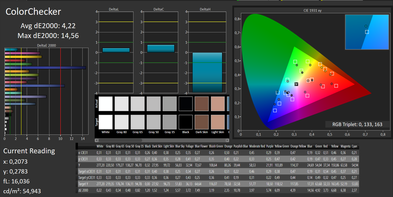 | Colorchecker dE 2000 max. * | 15.95 | 15.73 1% | 13.9 13% | 15.39 4% | 8.91 44% | 15.19 5% | 4 75% |