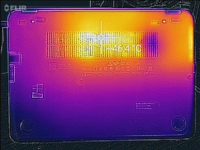 Unseren Stresstest (Prime95 und Furmark arbeiten für mindestens eine Stunde) durchläuft das Elitebook im Netz- und im Akkubetrieb auf unterschiedliche Weisen. Im Netzbetrieb arbeitet der Prozessor mit 1,5 bis 1,6 GHz, der Grafikkern mit 900 bis 1.000 MHz. Im Akkubetrieb liegen die Geschwindigkeiten bei 1,4 bis 1,8 GHz (CPU) bzw. 450 MHz (GPU). Die Erwärmung des Rechners fällt moderat aus. An allen Messpunkten registrieren wir Temperaturen unterhalb von 40 Grad Celsius.