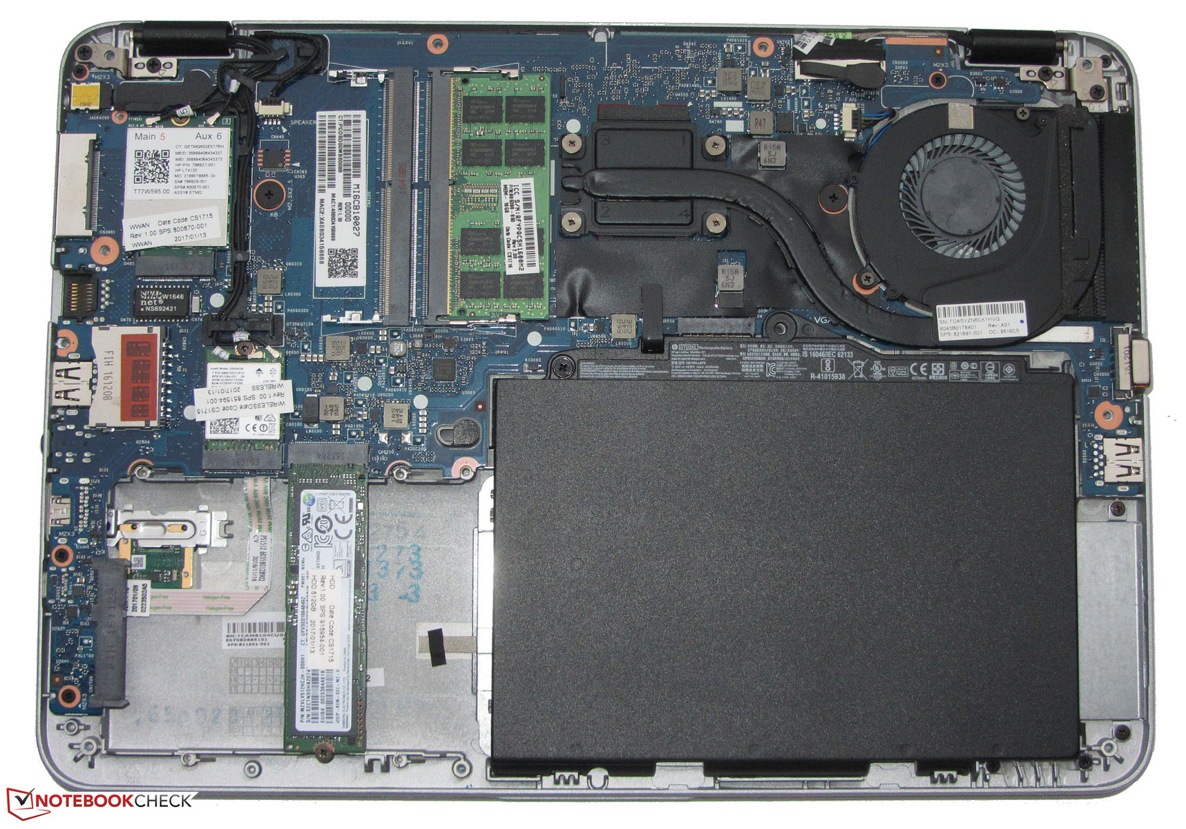Um an die Innereien des Elitebooks zu gelangen, muss die Unterschale demontiert werden - ein machbares Unterfangen. Dazu müssen alle Schrauben auf der Unterseite des Rechners gelöst werden. Um dies durchführen zu können, müssen als Erstes die Gummipfropfen entfernt werden, die die Schrauben verdecken. Die Pfropfen sind nur gesteckt, nicht verklebt. Eine weitere Schraube findet sich im Schacht des Speicherkartenlesers. Um an diese zu gelangen, muss der Dummy entnommen werden. Anschließend kann die Unterschale abgenommen werden. Es besteht dann Zugang zu den Arbeitsspeicherbänken (2 Stück), zur SSD, zum Akku, zum LTE-Modem, zum WLAN-Modul und zum Lüfter.