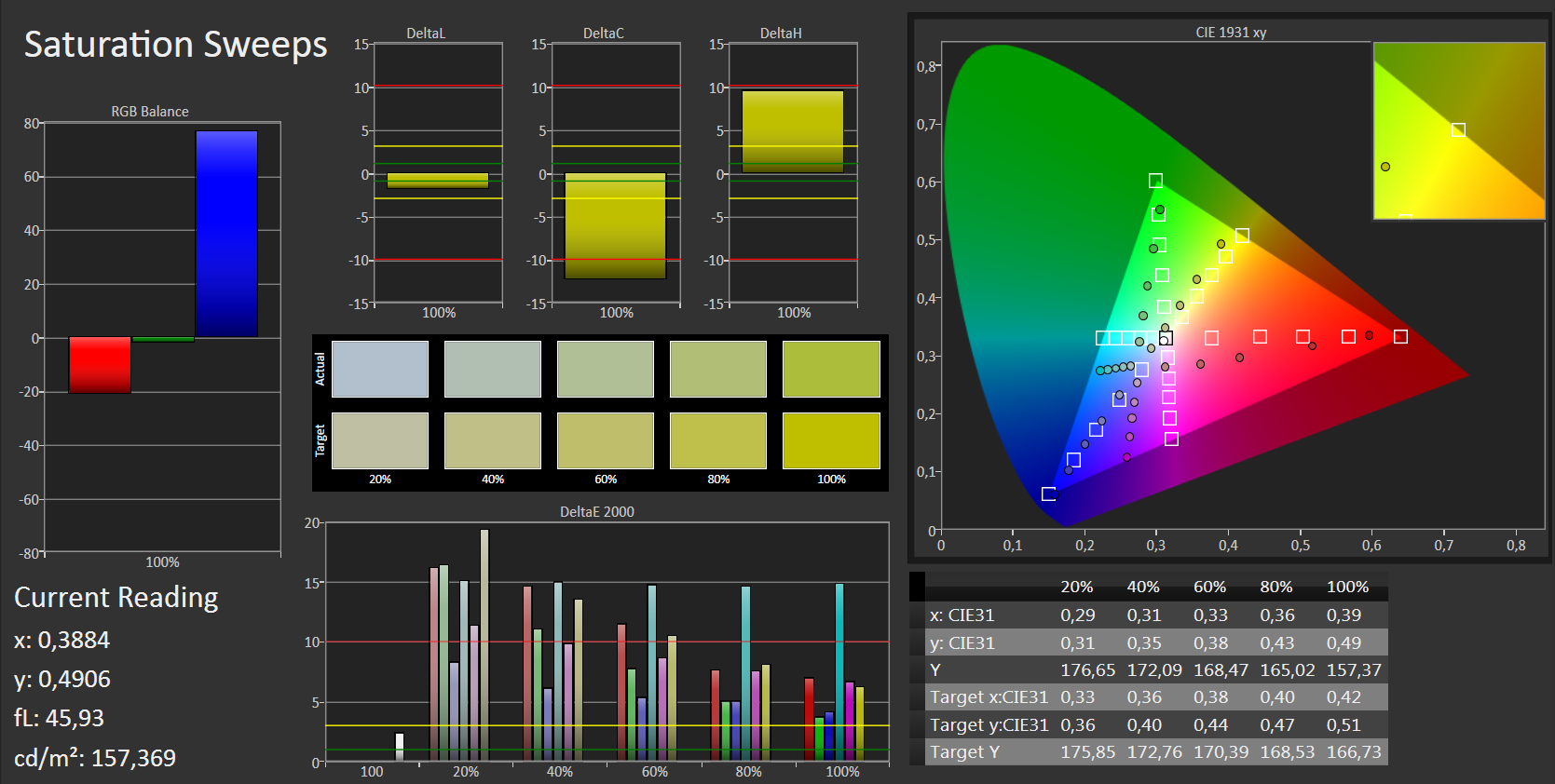 Mit dem Fotospektrometer ermitteln wir die Farbraumabdeckung und die sieht ähnlich schwach aus wie der Kontrast. Von sRGB werden nur 74 % abgedeckt, professionelle Bildbearbeiter wird das nicht zufrieden stellen, denn das TFT kann bestimmte Farben einfach nicht darstellen. Wenn es Farben darstellt, dann auch noch mit einem deutlichen Blaustich. Das ist der Auslieferungszustand, mit dem Farbprofil im Kasten kann der Effekt deutlich abgemildert werden. Viel wird das aber nicht nützen, denn das Panel hat ein Delta E von 10 bzw. 11,5 im Colorchecker bzw. in den Graustufen. Der Zielbereich wäre ein Wert <3. Den schaffen zwar auch die Konkurrenten mit ihren IPS Panels nicht, sie befinden sich mit 3-5 aber deutlich näher am Ziel. Farben, die das Panel anzeigt, entsprechen also nicht definierten Farbkarten des sRGB-Raumes. Die Unterschiede sind mit dem bloßen Auge leicht erkennbar, dies besagt das hohe DeltaE und Sie erkennen es unter CalMAN Farbsättigung bei Target und Actual.