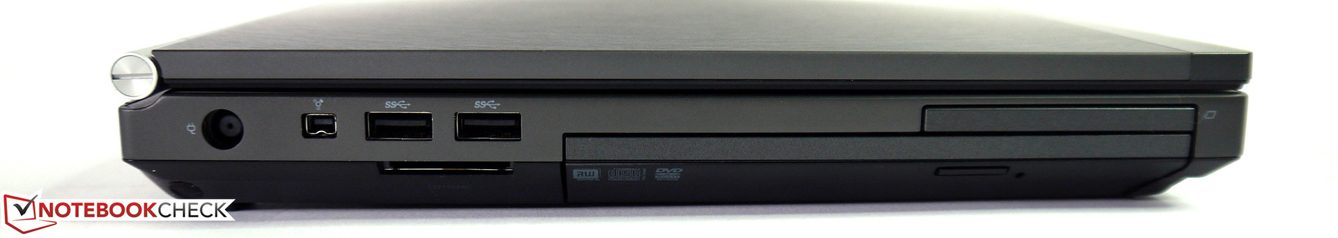 Die Schnittstellenverteilung hat man trotz der kleineren Seitenflächen deutlich besser gelöst und stellt sogar einen kleinen Mehrwert im Vergleich zum großen Bruder 8570w dar. Auf der linken Seite weit hinten befinden sich FireWire, Cardreader und USB 3.0, die bei angeschlossener Peripherie selbst für Linkshänder wenig störend auffallen sollten. Modemanschluss, Gigabit-LAN und VGA sind am Heck positioniert und stören damit gar nicht, sind aber dafür etwas umständlicher zu erreichen. Die Schnittstellen auf der rechten Seite befinden sich wiederum im kritischen Bereich der Maus-Hand, gefallen dafür aber mit guter Erreichbarkeit und sollten abgesehen vom DisplayPort und eSata-Anschluss nur dann gebraucht werden, wenn die anderen USB-Ports schon belegt sind.