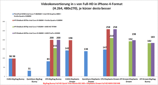 Dass die Gesamtperformance für die Standardaufgaben wie Office, Internet und Bildbearbeitung problemlos ausreicht, kann man bei einer Workstation bedenkenlos voraussetzen. 8.223 Punkte beim PC Mark Vantage und 2.285 Punkte beim PC Mark 7 sind gute Ergebnisse, die eine ordentliche Business-Tauglichkeit bestätigen. Auch Konvertierungsaufgaben werden zügig umgesetzt und stellen das Notebook vor keine großen Probleme. Falls eine GPU-Nutzung von der jeweiligen Software unterstützt wird, ist zum einen eine im Vergleich zur CPU-Konvertierung beschleunigte Abarbeitung festzustellen und zum anderen ist eine deutlich geringere CPU-Last von 4 – 60 %, anstatt über 90 % je nach Aufgabe, zu verzeichnen.