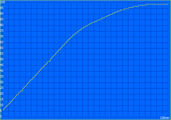 Der entleerte Lithium-Ionen-Akku brauchte im Test 130 Minuten um seine volle Ladekapazität von 100 Prozent wieder zu erreichen.