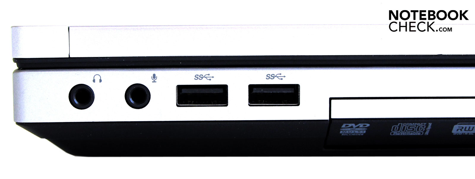 Bei den Anschlüssen hat HP alles verbaut, was man bei einem Business Notebook brauchen könnte. Jeweils an den Außenseiten hat der Hersteller die Erweiterungsmöglichkeiten positioniert: Neben den beiden USB 2.0-Buchsen, besitzt das Gerät auch zwei Buchen nach dem USB 3.0-Standard. Hierbei sind links die Buchsen mit USB 2.0-, rechts die mit 3.0-Unterstützung angeordnet. Außerdem gibt es links noch eine kombinierte eSATA/USB-Buchse. Die Abstände zwischen den jeweiligen Buchsen sind recht knapp dimensioniert. Wenn zwei breitere USB-Sticks zum Einsatz kommen sollen, können die sich gegenseitig stören.