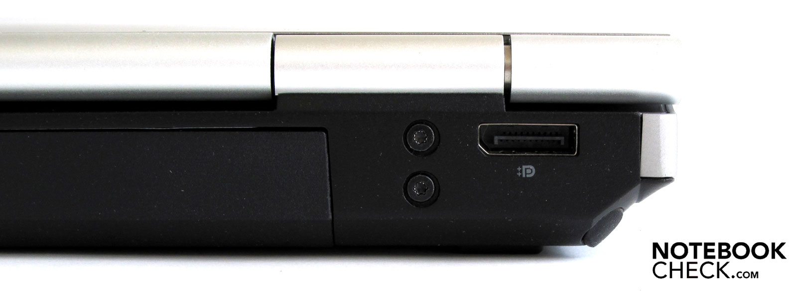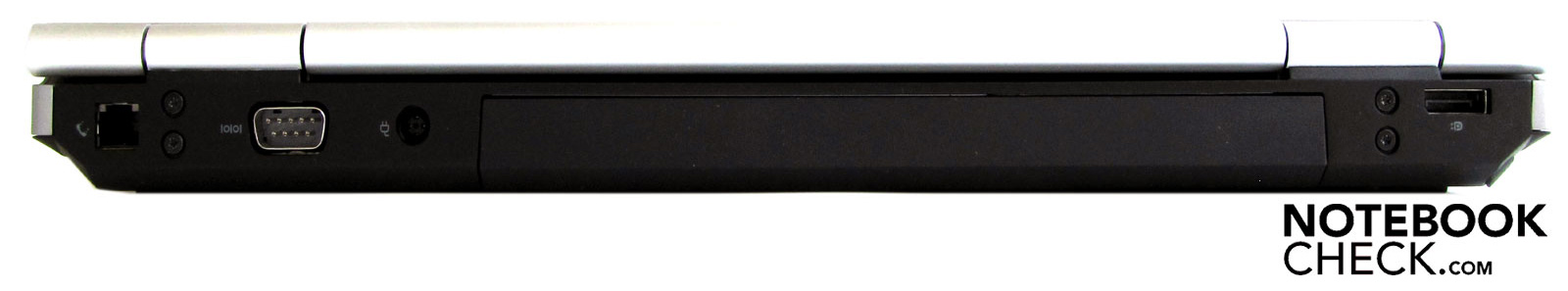 Für den Sound besitzt das Notebook zwei Klinkenbuchsen, die sich zum einen für einen Kopfhörer und zum anderen mit einem Mikrofon nutzen lassen. Neben dem DVD-Brenner ist die RJ45-LAN-Buchse vorzufinden. Schaut man jetzt ums Eck auf die Rückseite, kommen die Anschlüsse fürs Modem, RS232, Power und links außen der Displayport zum Vorschein.