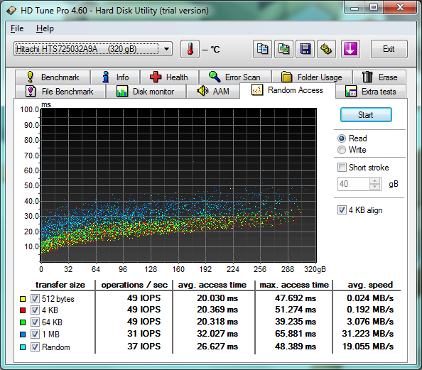 Als Massenspeicher kommt im Elitebook 8560p LQ589AW eine 2,5-Zoll-Festplatte von Hitachi der Serie Travelstar 7K500 zum Einsatz. Die Speicherkapazität beträgt 320 GByte. Das ist nicht besonders viel, aber sollte zum Speichern der Geschäftsdaten ausreichen. Die Platte wird per Serial-ATA ans System gebunden und rotiert mit 7.200 Umdrehungen pro Sekunde. Die Festplattenperformance liegen in den erwartenden Bereichen. Die Transferrate wurde mit HD Tune mit maximal 109.4 MByte pro Sekunde gemessen.