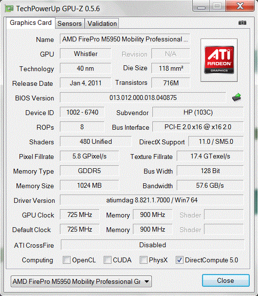 HD-Videos werden mithilfe des UVD-3-Decoders beschleunigt, per HDMI kann die Grafikkarte ein Surround-Signal ausgeben. Hergestellt wird die FirePro M5950 im 40-nm-Prozess. Da HP zum Testzeitpunkt keinen aktuellen Treiber anbot, nutzten wir die vorinstallierte und schon ein paar Monate alte Version 8.821.1.7000. Inklusive Dockingstation kann die Grafikkarte übrigens bis zu fünf Monitore mit Bildmaterial versorgen (Eyefinitiy).
