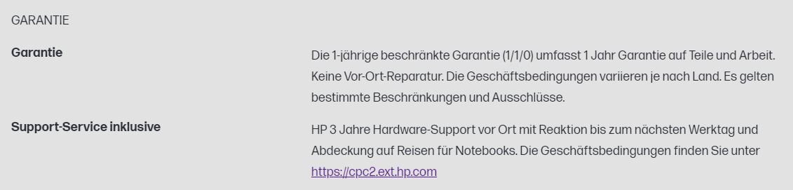 Bei der Garantie gibt sich HP etwas kryptisch, denn der Hersteller spricht sowohl von einer 1-jährigen beschränkte Garantie (1/1/0), die 1 Jahr Garantie auf Teile und Arbeit umfasst, sowie von einem inklusiven 3-Jahres-Hardware-Support-Service vor Ort mit Reaktion bis zum nächsten Werktag und Abdeckung auf Reisen für Notebooks.