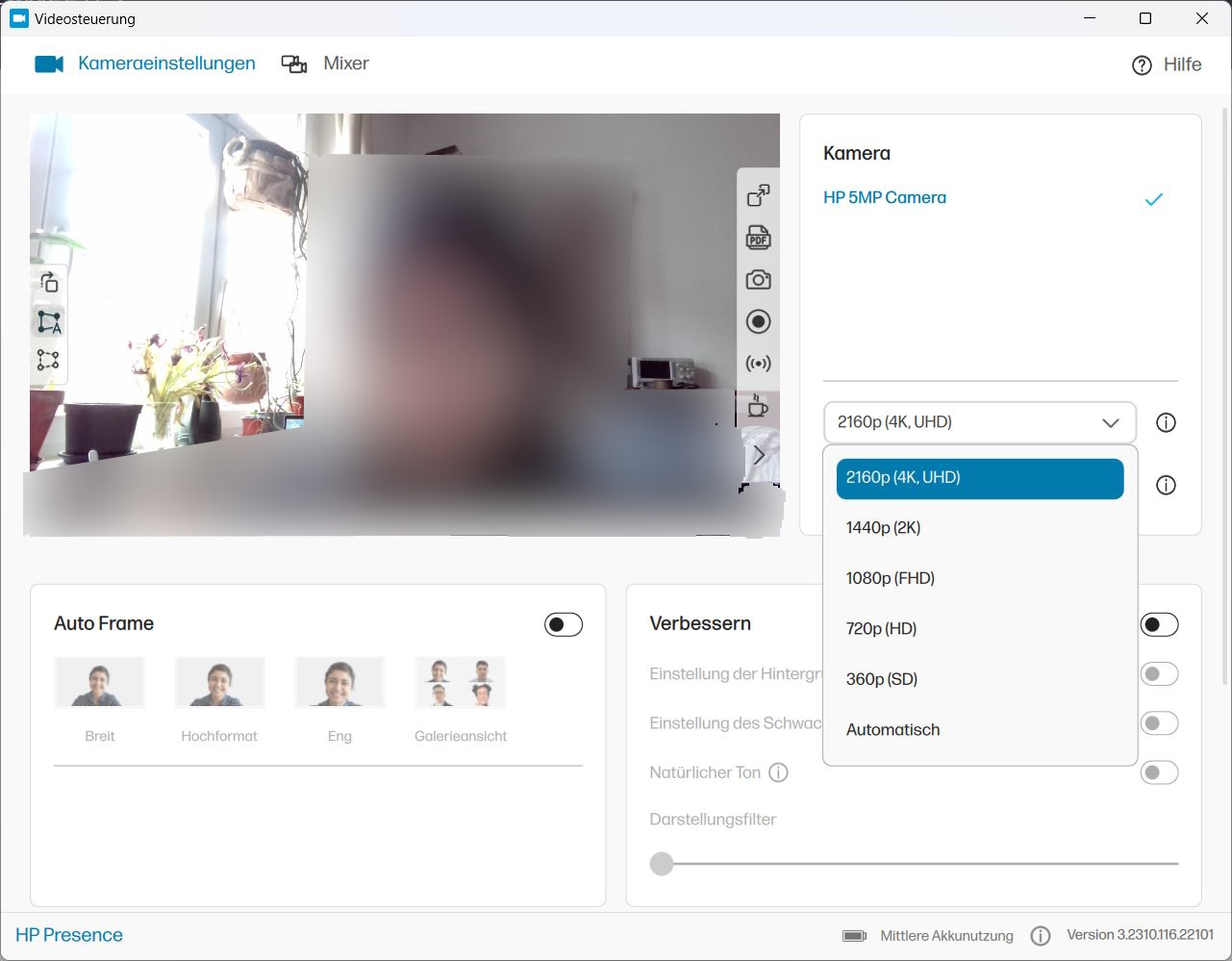 Über die Software myHP lassen sich noch einige wenige Funktionen der Webcam steuern, vom Auto Framing über die Auflösung bis hin zu ein paar Bildver(schlimm)besserungen wie "Natürlicher Ton" (Hautton-Boost, färbt das Bild mit Rotstich) oder den "Darstellungsfilter, Letzterer scheint einfach weich zu zeichnen, was Unschärfe im Bild hinzufügt.