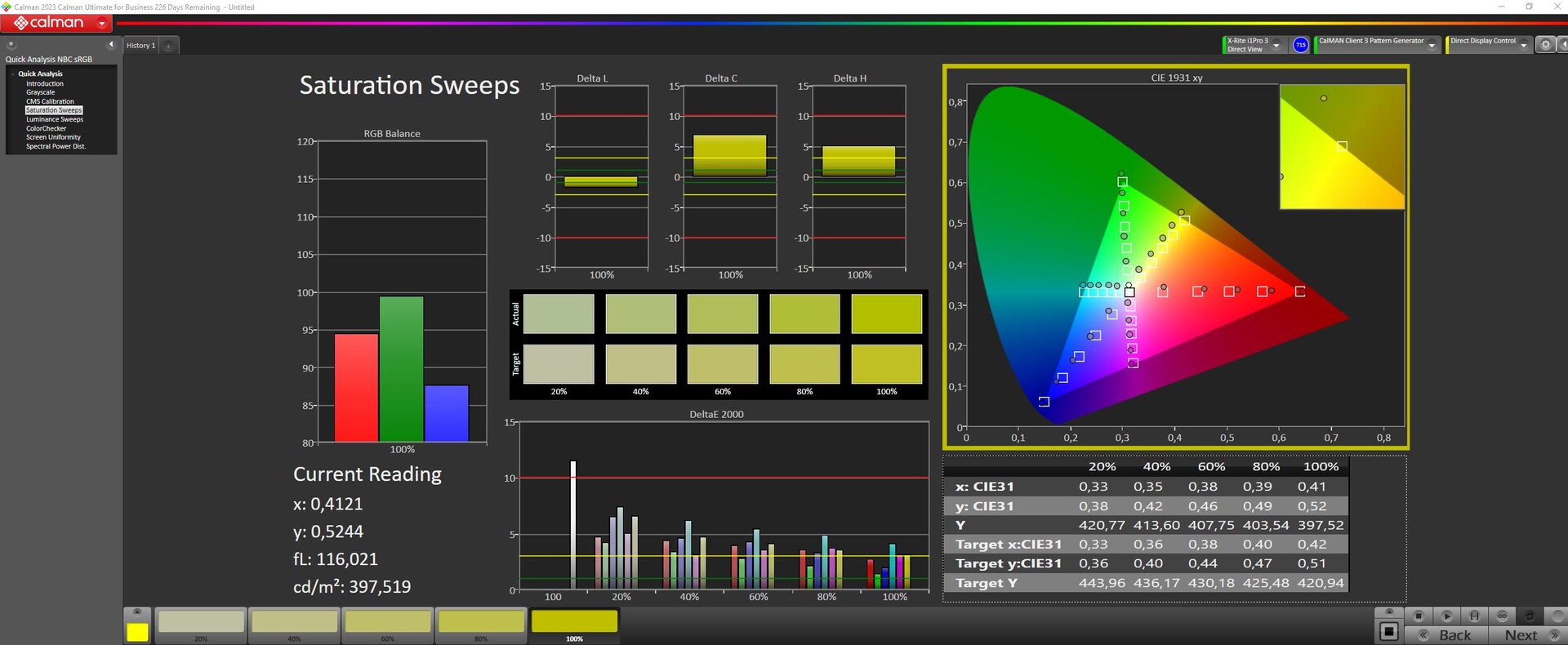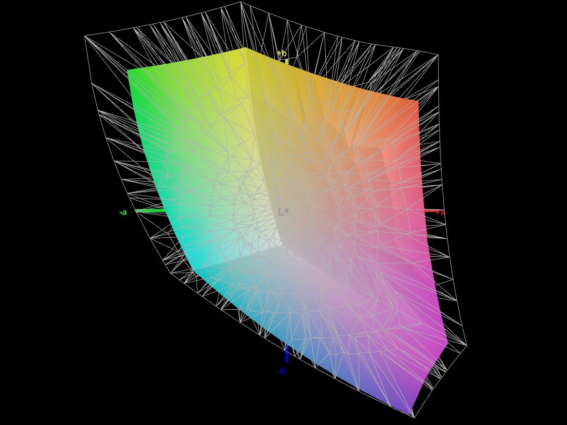 Ab Werk präsentiert das Display einen ziemlich schlechten Ausgangszustand, was die Kalibrierung angeht. Im Calman ColorChecker messen wir einen durchschnittlichen DeltaE-Wert von 4,86, der maximale Wert liegt bei über 11. Durch eine manuelle Kalibrierung können wir den Durchschnittswert auf nahezu 1 drücken (max liegt dann bei 1,7).