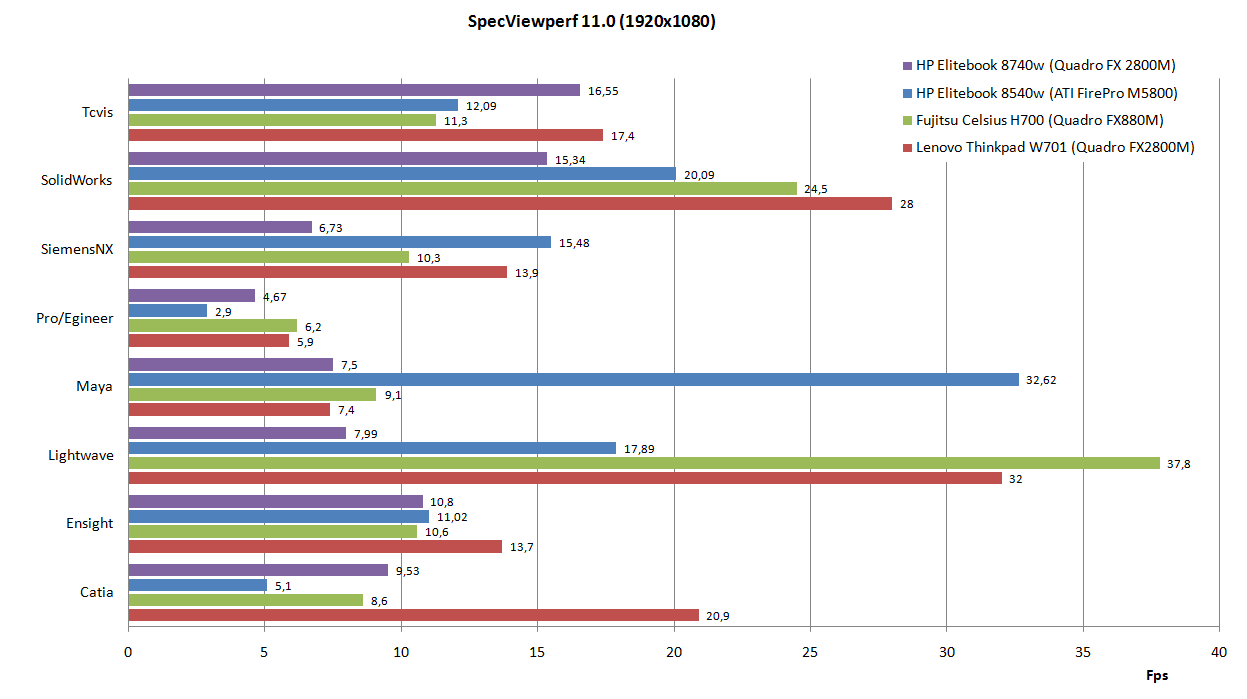 Die Leistungsreserven in Hinsicht auf konkrete Anwendungen zu beurteilen ermöglicht der SPEC Viewperf Benchmark, getestet in der Version 11.0. Durchwegs überraschend fällt das Testergebnis aus: In vielen Wertungen bleibt das HP 8740w in der vorliegenden Ausstattung und mit den vorinstallierten Treibern (8.16.11.8918 / FW 189.18) doch deutlich hinter den Ergebnissen des ähnlich ausgestatteten Lenovo Thinkpad W701 und sogar hinter dem 8540w aus eigenem Haus (FirePro M5800) zurück.