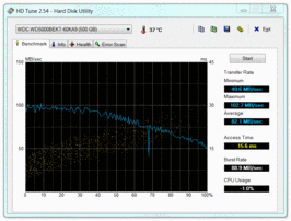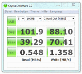 Die in unserem Testsample eingesetzte Scorpio Black WD5000BEKT Harddisk von Western Digital bietet eine Bruttospeicherkapazität von 500GB bei einer Umdrehungsgeschwindigkeit von 7200 Touren. Die HDTune bzw. CrystalDiscmark-Test beobachteten Werte liegen durchwegs im erwarteten Bereich und zeigen lechte Geschwindigkeitsvorteile im Vergleich zu üblichen 5400rpm-Modellen.