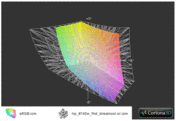 Der sRGB Farbraum kann etwa vollständig abgedeckt werden, der Adobe RGB Farbraum bricht unseren Messungen zufolge teils etwas aus dem darstellbaren Farbraum aus. Consumer-Panels werden damit ebenso deutlich in die Tasche gesteckt wie Displays mit erweitertem Farbraum, zu finden etwa im HP Envy 14 mit Radiance Display oder in den aktuellen Macbook Pros.