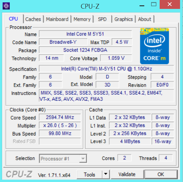 Eine signifikante Neuerung ist die eingesetzte CPU in unserem Test-Notebook. Mit neuer Broadwell Architektur fällt HPs Wahl auf einen Intel Core M-5Y51. Ein Grundtakt von 1,1 GHz und eine Turbo-Modus-Frequenz von 2.600 MHz müssen sich gegen potente Konkurrenten behaupten. Im Lenovo ThinkPad finden wir eine Intel Core i7-5600U, die einen Taktbereich von 2,6-3,2 GHz aufweist. Der große Taktbereich des EliteBooks soll sich besonders für den Office- und Multimediabereich eignen. Einige anspruchsvollere Anwendungen sind dennoch denkbar. Seitens Intel wird ein TDP von lediglich 4,5 W angegeben. Die Leistungsaufnahme der Konkurrenz ist 10,5 W höher - zumindest wenn man Intels optimistischen Angaben glauben mag. Inwiefern sich die verschiedenen CPU-Typen unterscheiden, wollen wir in den Cinebench Benchmarks analysieren. Hierzu werfen wir einen Blick auf den Multicore-Test der Cinebench Version R15. Die Kontrahenten erzielen gleich zweimal so viele Punkte wie unser Testkandidat. Auch der Singlecore-Test ändert dieses Verhalten nicht. Die Taktfrequenz des EliteBooks lag während der Tests zwischen 1,4 und 1,5 GHz.