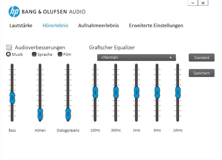 Interessanterweise verbaut HP bei dem kleinsten Gerät der EliteBook Baureihe zwei Lautsprecher pro Seite. Diese verstecken sich hinter ansprechend gestalteten Lochgittern auf der Unterseite des Notebooks, wodurch der Klang auf weichen Unterlagen etwas gedämpft wird. Die Module werden mit bis zu 83 dB(A) sehr laut, und insgesamt sind wir von dem Klang positiv überrascht, vor allem in Anbetracht der kompakten Größe. Zwar fehlt der Nachdruck, aber die Wiedergabe von Musik und Filmen macht durchaus Spaß. Der Schriftzug Bang & Olufsen bezieht sich übrigens nur auf die Audio-Software, die einige vordefinierte Profile sowie einen Equalizer zur Verfügung stellt. Durch die Software wird der Klang etwas voller, nur bei der Verwendung von guten Kopfhörern sollte man sie für eine möglichst natürliche Wiedergabe deaktivieren. Die Wiedergabe am Klinkenstecker ist rauscharm und sehr laut, weshalb man den Pegel hier zunächst verringern sollte, bevor man die Kopfhörer aufsetzt. Zusätzlich haben wir einen Bluetooth-Lautsprecher (Denon Envaya Mini) ausprobiert. Auch hier war die Verbindung sehr stabil, und es gab keine Aussetzer.