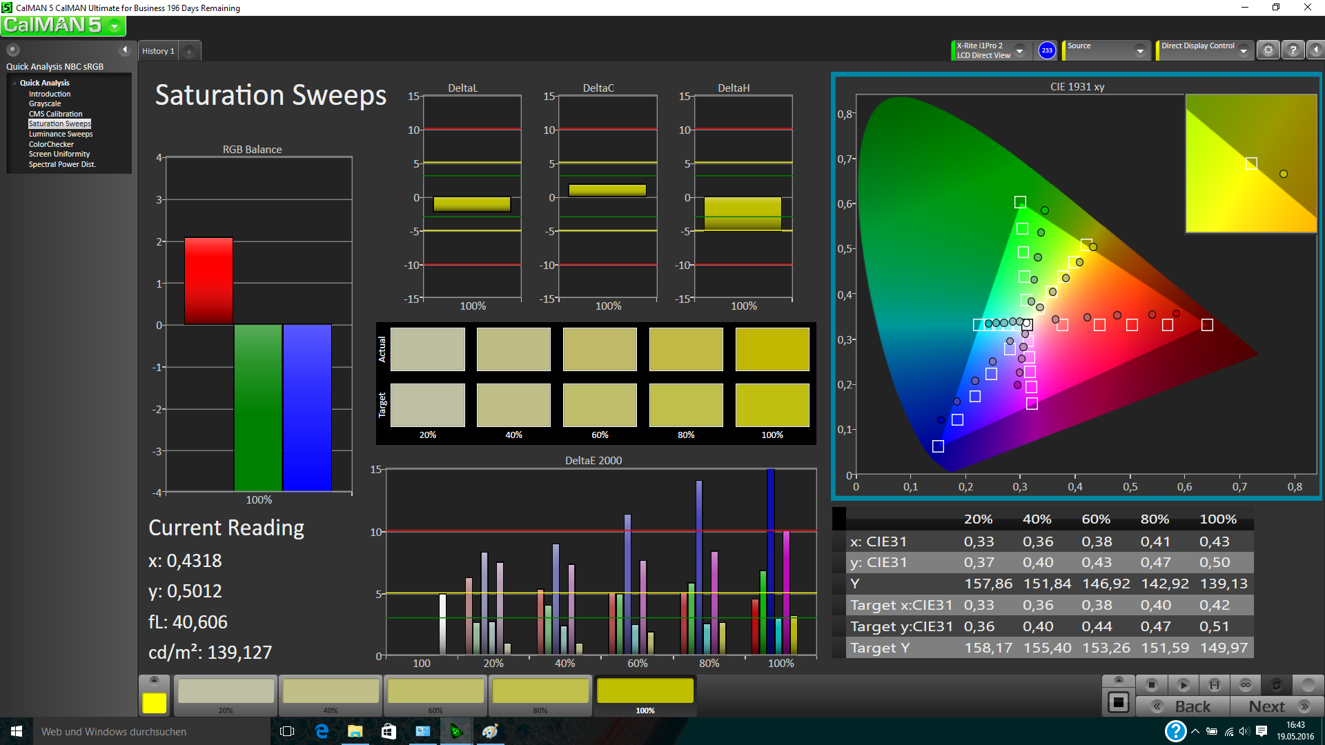 Die durchschnittlichen DeltaE-2000-Abweichungen der Farben und der Graustufen sind mit 4,82 bzw. 3,84 bereits im Werkszustand ordentlich. Vor allem bei den Farben gibt es bei den Blautönen aber extreme Ausreißer (>12), die auch mit einer Kalibrierung nicht beseitigt werden können. Diese hilft vor allem den Graustufen, deren durchschnittliche Abweichung gegenüber dem sRGB-Farbraum auf gerade einmal 0,42 fällt, und auch die Farbdarstellung verbessert sich leicht auf 3,35.