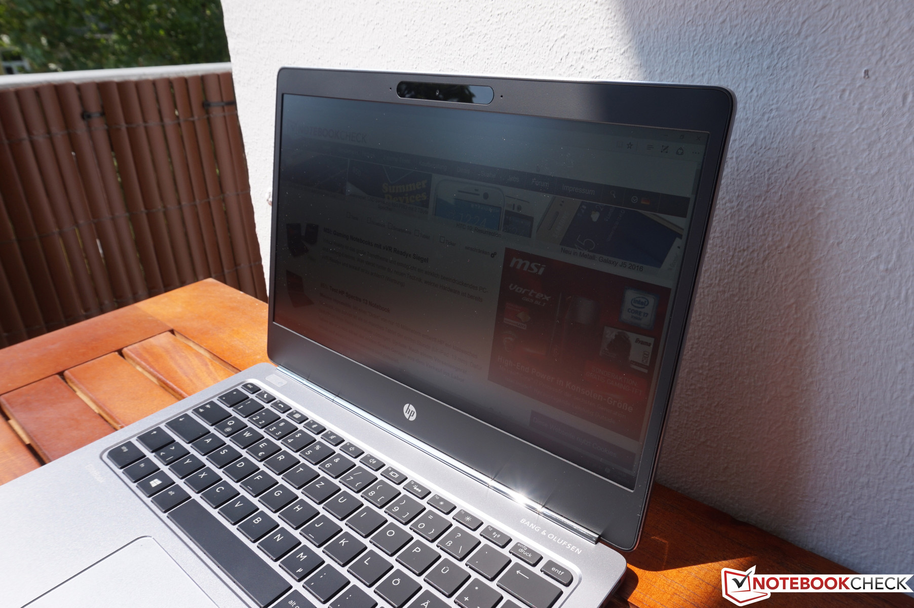 Dank der guten Helligkeit, die im Akkubetrieb nicht reduziert wird, sowie der matten Bildschirmoberfläche, kann man mit dem EliteBook Folio G1 auch komfortabel in hellen Umgebungen arbeiten. Lediglich direkte Sonneneinstrahlung sollte man vermeiden, da das Bild ansonsten etwas ausgewaschen wirkt. Auch bei den Blickwinkeln gibt es keine Probleme. Das IPS-Panel ermöglicht ein stabiles Bild aus allen Positionen, lediglich aus extrem schrägen Winkeln ist ein leichter Helligkeitsverlust sichtbar.