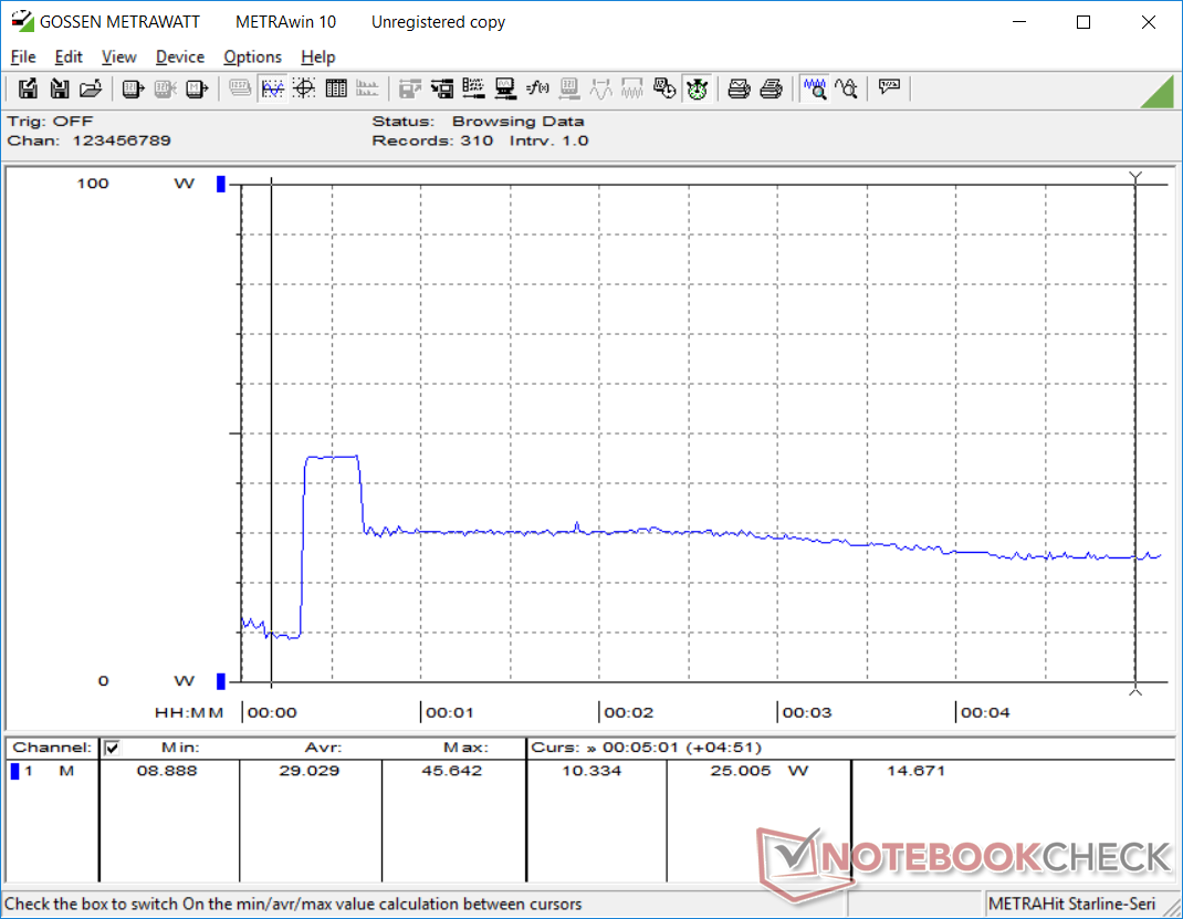 Im Leerlauf verbraucht das Notebook je nach Energieprofil und Helligkeit zwischen 4 und 9 Watt. Der Unterschied zwischen minimaler und maximaler Helligkeit liegt übrigens bei rund 4 %, wobei der Wert bei dem optionalen 700-cd/m²-Panel noch größer ausfallen dürfte.