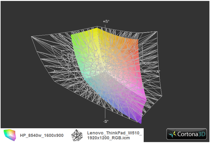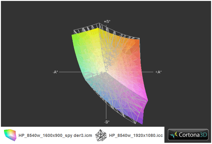 Was die Farbraumabdeckung betrifft, präsentiert sich das Display mit einem Panel mit erweitertem Farbraum. Der sRGB Farbraum kann etwa beinahe abgedeckt werden, ähnlich wie das bereits getestete Full-HD Panel im HP 8540w. Handelsübliche Consumer-Notebooks können damit zwar eindeutig distanziert werden, Profi-Displays, zu finden etwa in Lenovos Thinkpad W510 mit RGB-Display, spielen aber immer noch in einer ganz anderen Liga. Diesbezüglich bietet HP nun auch Modelle mit dem Dreamcolor-IPS Display an, das laut HP den sRGB Farbraum zu 149% abdecken soll und außerdem mit den für diese Technologie besonders stabilen Blickwinkeln (HP: 89° in alle Richtungen) beeindrucken soll. Ein Sample für einen entsprechenden Test ist bereits geordert. Vergleicht man den Farbraum mit der Full-HD Variante des bereits getesteten Gerätes, fallen nur geringe, irrelevante Abweichungen auf.