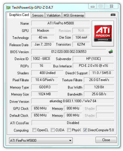 Geändert hat sich im Vergleich zur zuerst getesteten Variante (Nvidia Quadro FX 880M) auch die Grafikkarte. Für die Pixelberechnung zeichnet sich nunmehr ein Chip von ATI verantwortlich, im Detail eine ATI FirePro M5800 Grafikkarte. Hierbei handelt es sich um eine professionelle Workstation Grafikkarte von AMD mit DirectX 11 Unterstützung. Die GPU basiert auf den Madison Chip (5700 Serie, 40nm Fertigung). Im vorliegenden HP Elitebook 5840w wird die Firepro M5800 mit einem Gigabyte DDR3 Speicher (128Bit Anbindung) ausgestattet. Der Lerntakt der M5800 beträgt maximal 650MHz, der Speichertakt 800MHz.
