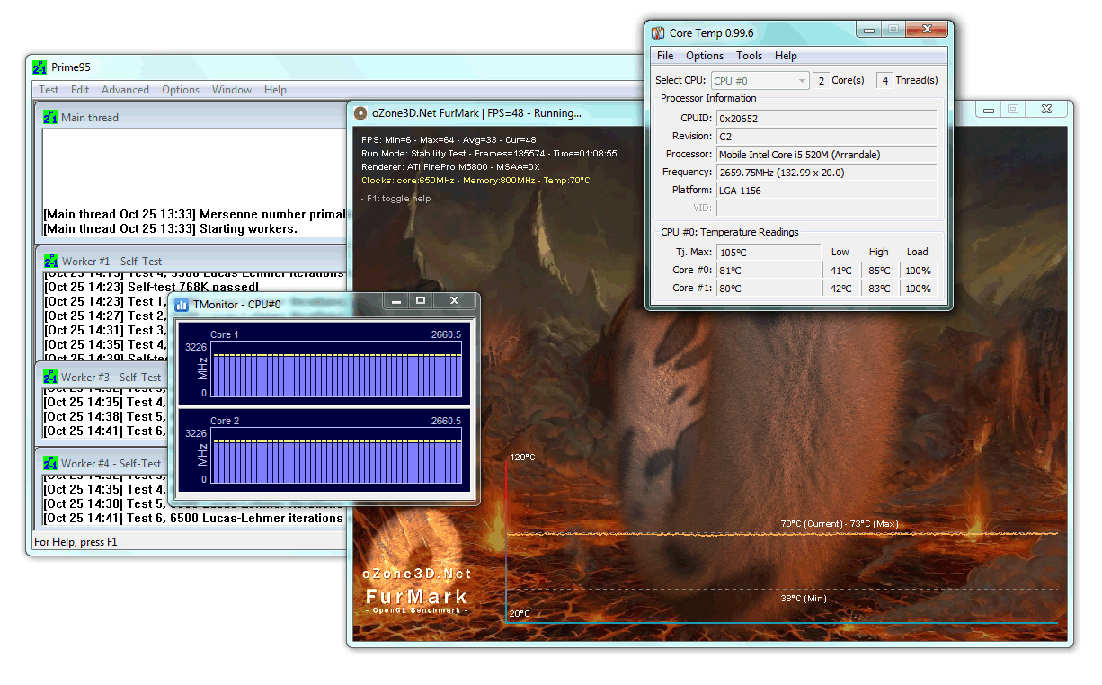 Dass die eingesetzte Hardware sogar noch Kühlreserven ortet, zeigen die beobachteten Taktraten der eingesetzten i5-520M CPU. Diese taktet in beiden Kernen im Stresstest konstant mit 2.66 GHz, sprich mit aktiven Turbo-Modus (Basistakt 2.4 GHz). Dies passiert nur, sofern der Intel–Chip entsprechende Kühlreserven vorfindet.