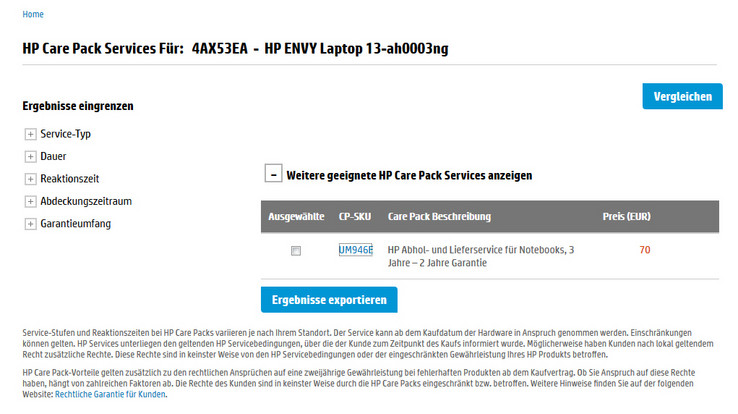 Das Envy ist mit einer zweijährigen Garantie ausgestattet - inklusive Abholservice. Laut HP-CarePack-Central-Webseite existiert nur eine Garantieerweiterung für das Envy: Eine Erweiterung des Garantiezeitraums auf 3 Jahre. Dafür müssten 70 Euro auf den Tisch gelegt werden.