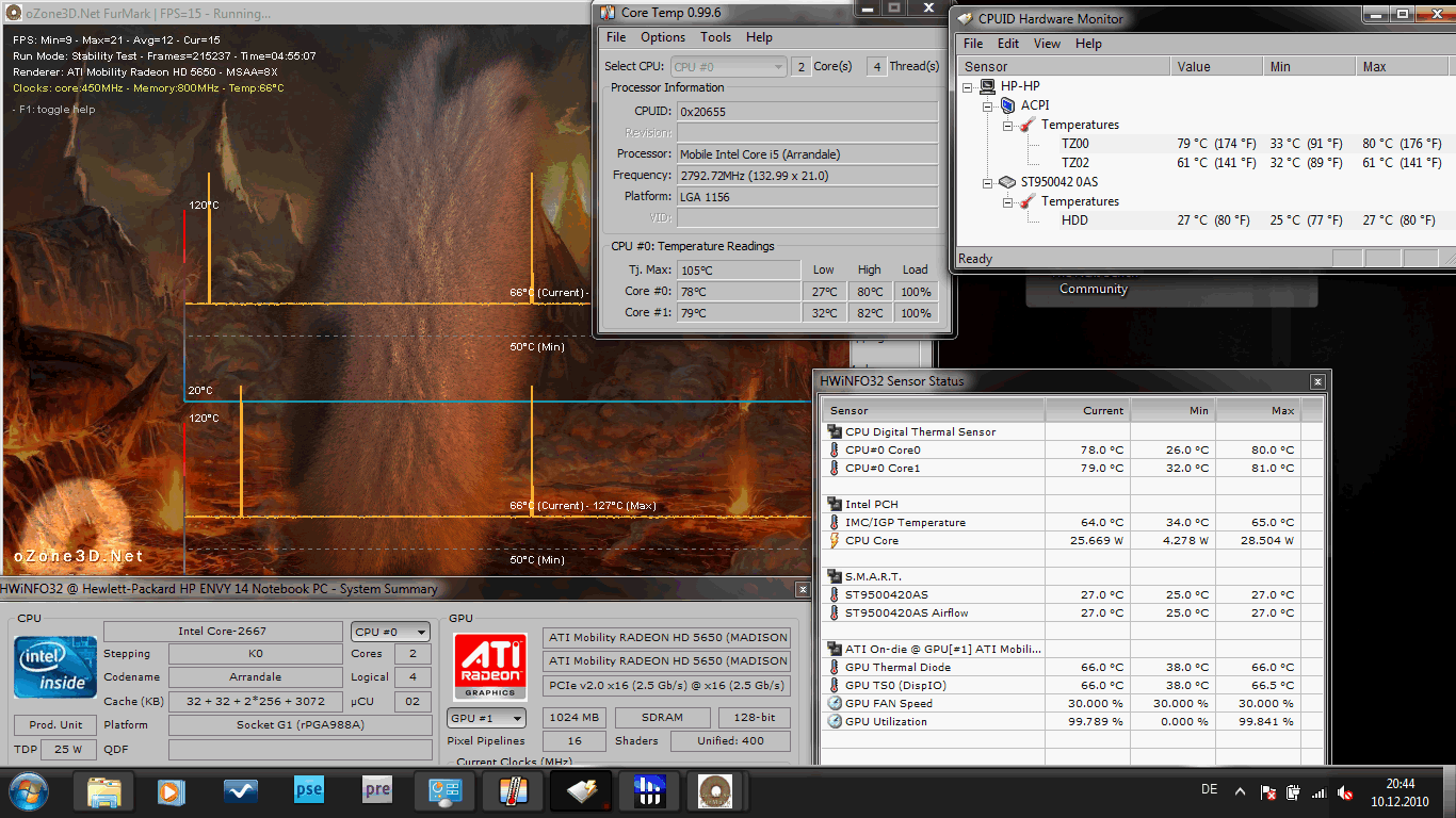Der maximale CPU-Stromverbrauch liegt laut TDP bei 35 Watt. Davon zehren im Belastungsfall die zwei Rechenkerne, die Intel HD Graphics und der integrierte Speichercontroller. Im Testgerät ist die Intel HD aktiviert und kann manuell oder automatisch zur dedizierten ATI HD 5650 umgeschalten werden. Es handelt sich um eine Hybrid-Grafik, nicht um Nvidia Optimus (ATI GPU!).