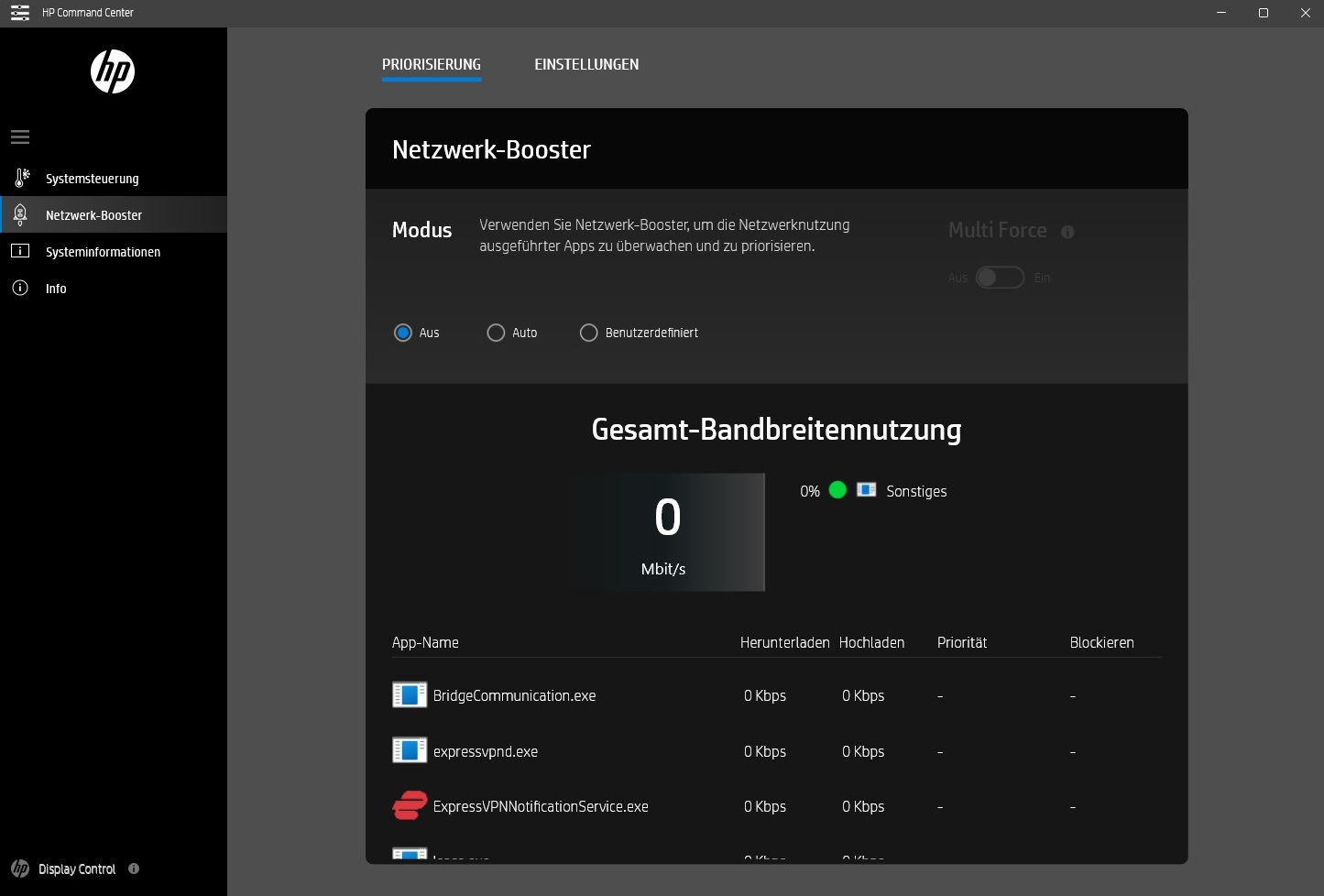 Im übersichtlichen HP Command Center dürfen Nutzer unter anderem an der Systemsteuerung schrauben. Wie auf dem Screenshot zu sehen ist, existieren ganze 4 Gerätemodi, wobei 3 davon mit zusätzlichen Schiebereglern versehen sind. Unsere Messungen basieren auf dem Auslieferungszustand, was das Profil „Ausgeglichen“ bedeutet. In den anderen Modi können die ermittelten Ergebnisse natürlich abweichen.