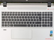 Das Layout der Tastatur des HP Envy 15-k010ng hält kaum Überraschungen bereit. Die linken Strg- und Shift-Tasten haben leider nur die Größe der Buchstabentasten. Viel Hub haben die flachen, rutschhemmenden Tasten nicht, was den Tester aber nicht gestört hat. Kritikpunkte sind eher der weiche Anschlag und der nicht besonders knackige Druckpunkt. Zudem gibt das Keyboard schon bei normaler Betätigung der Tasten etwas nach. Gelungen ist die gleichmäßige und ausreichend helle Tastaturbeleuchtung, die sich per Hotkey aktivieren lässt, aber nicht dimmbar ist.