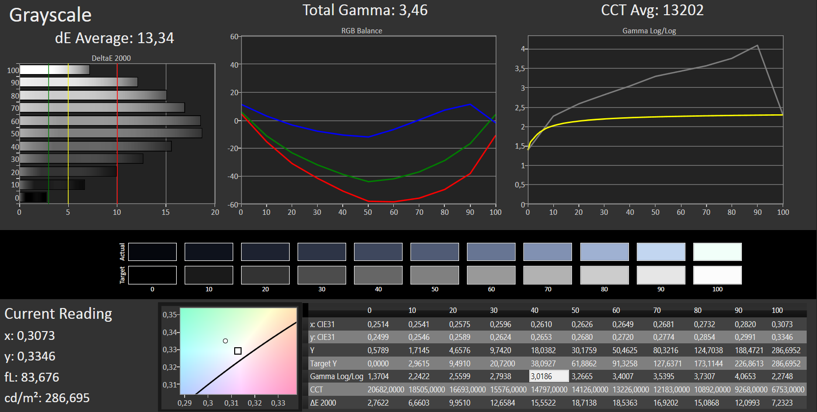 ΔE Greyscale Calman: 13.34 | ∀{0.09-98 Ø5}